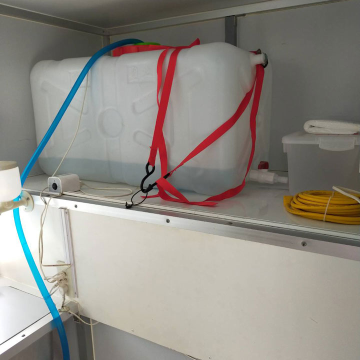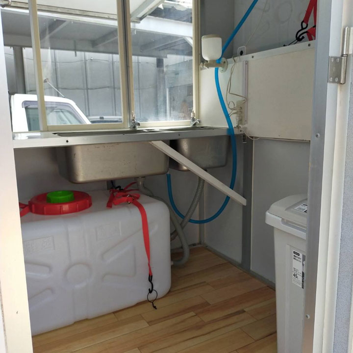 換気扇有り、2層シンク、冷蔵・冷凍車、2400Wバッテリー、ガスコンロ1個、200リットル給水タンクマウンテン、200リットル排水タンク、ゴミ箱